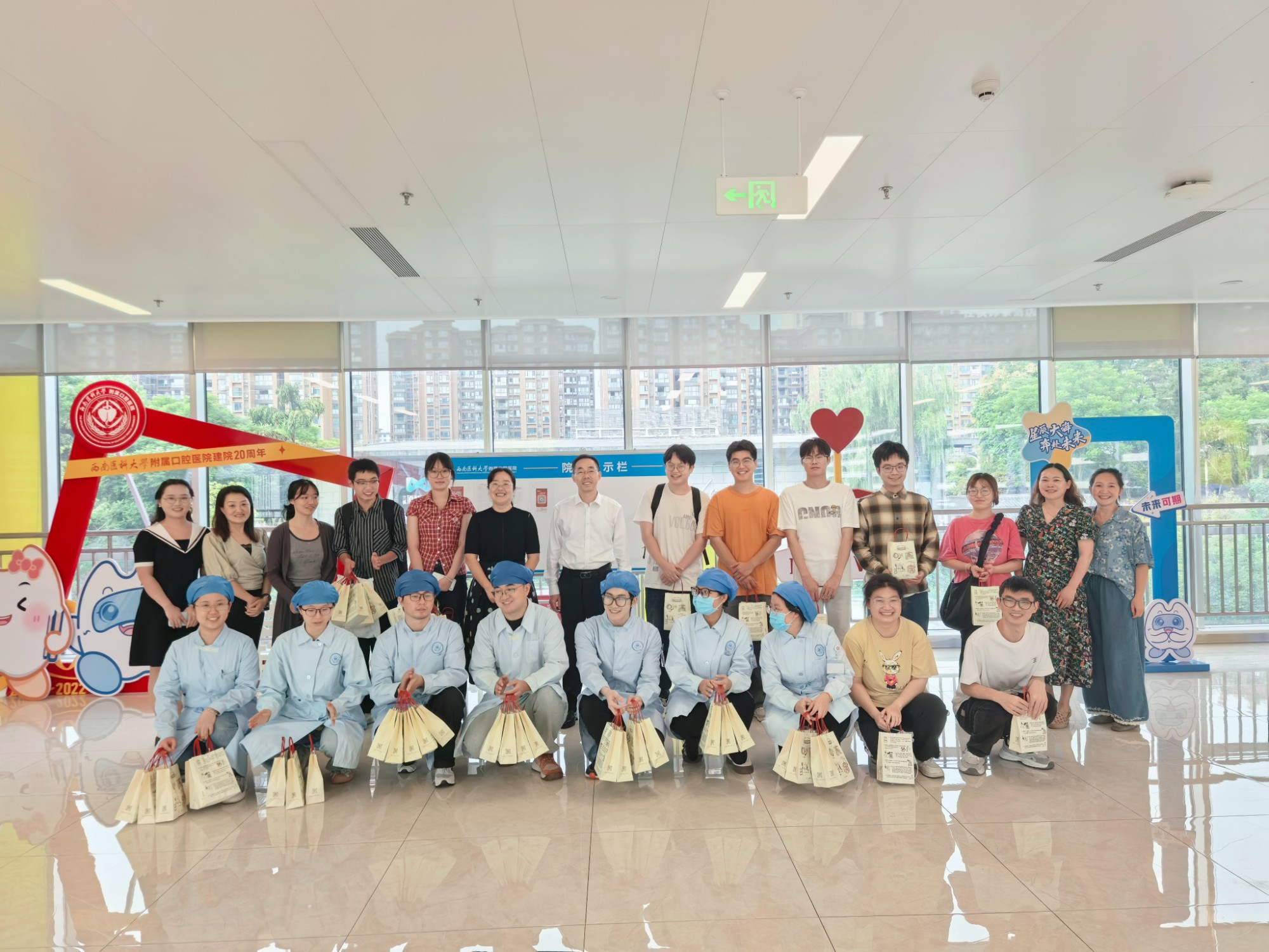 秋色如许,月满情深。在中秋佳节即将来临之际,为弘扬中华优秀传统文化,营造温馨祥和的节日氛围,让莘莘学子感受到口腔大家庭的温暖与关怀,9月28日下午口腔医学院·附属口腔医院精心组织了“中秋节”慰问活动。医院院长肖金刚、副院长郭玲、学科建设办公室主任唐燕、教务科科长李兰萍及学科办、教务科工作人员向全体学生发放了饱含深情厚谊的中秋月饼,并致以最诚挚的节日祝福。让同学们感受到了学院的关怀,领导和老师们的关爱。