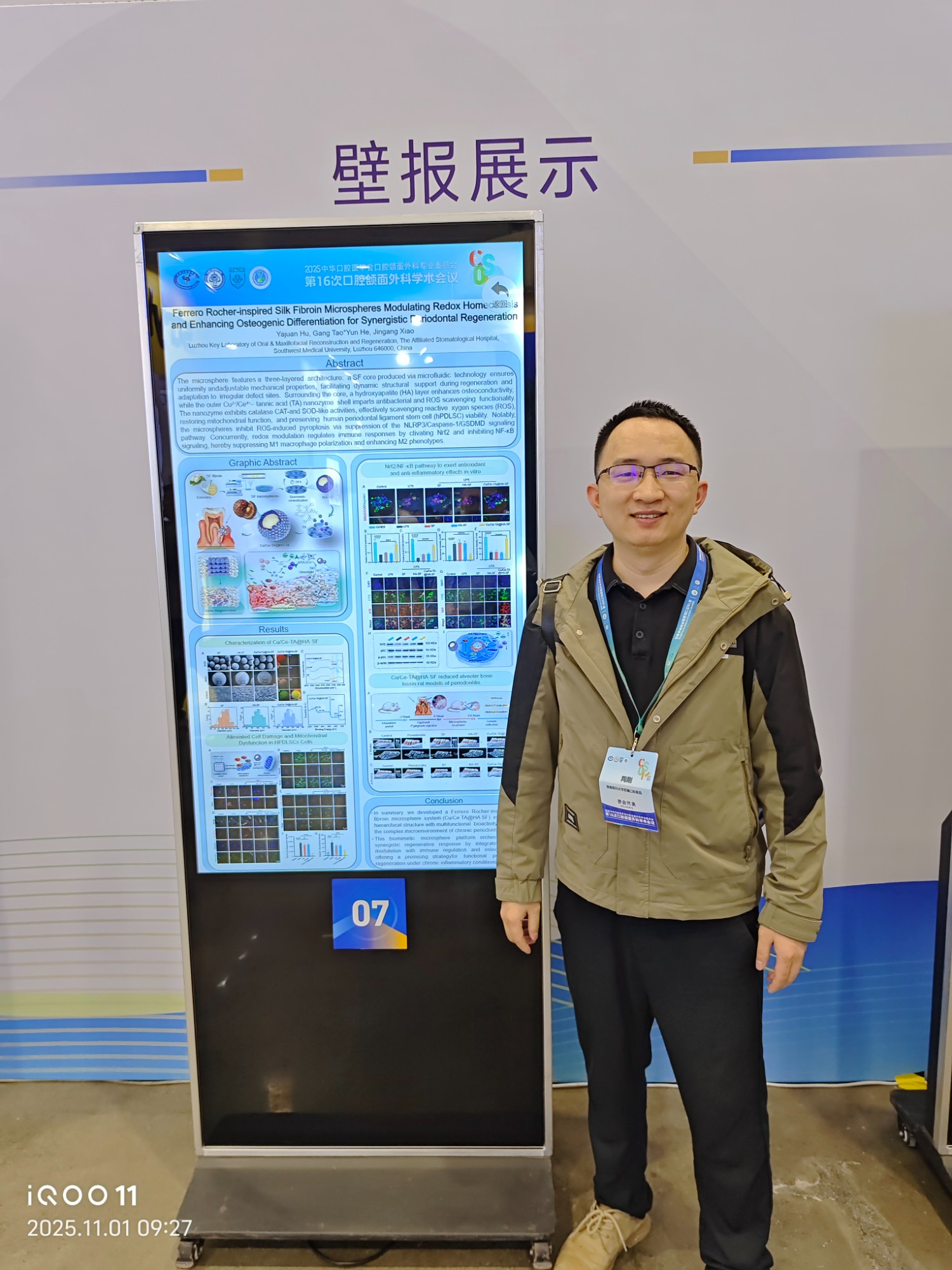 陶刚副研究员以《费列罗巧克力灵感来源的丝素蛋白微球通过调节氧化还原稳态和促成骨分化加速牙槽骨再生》为题进行壁报展示;