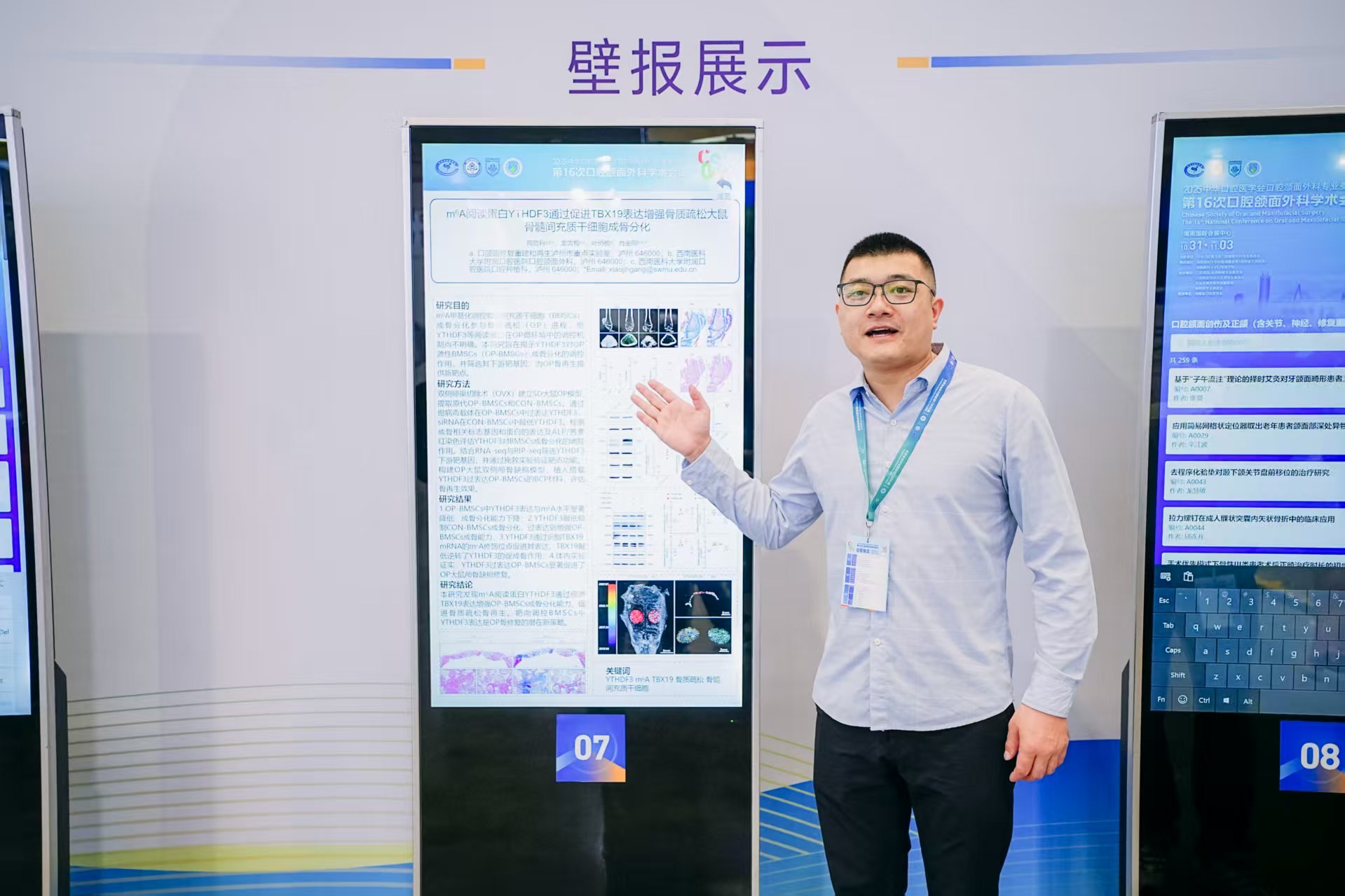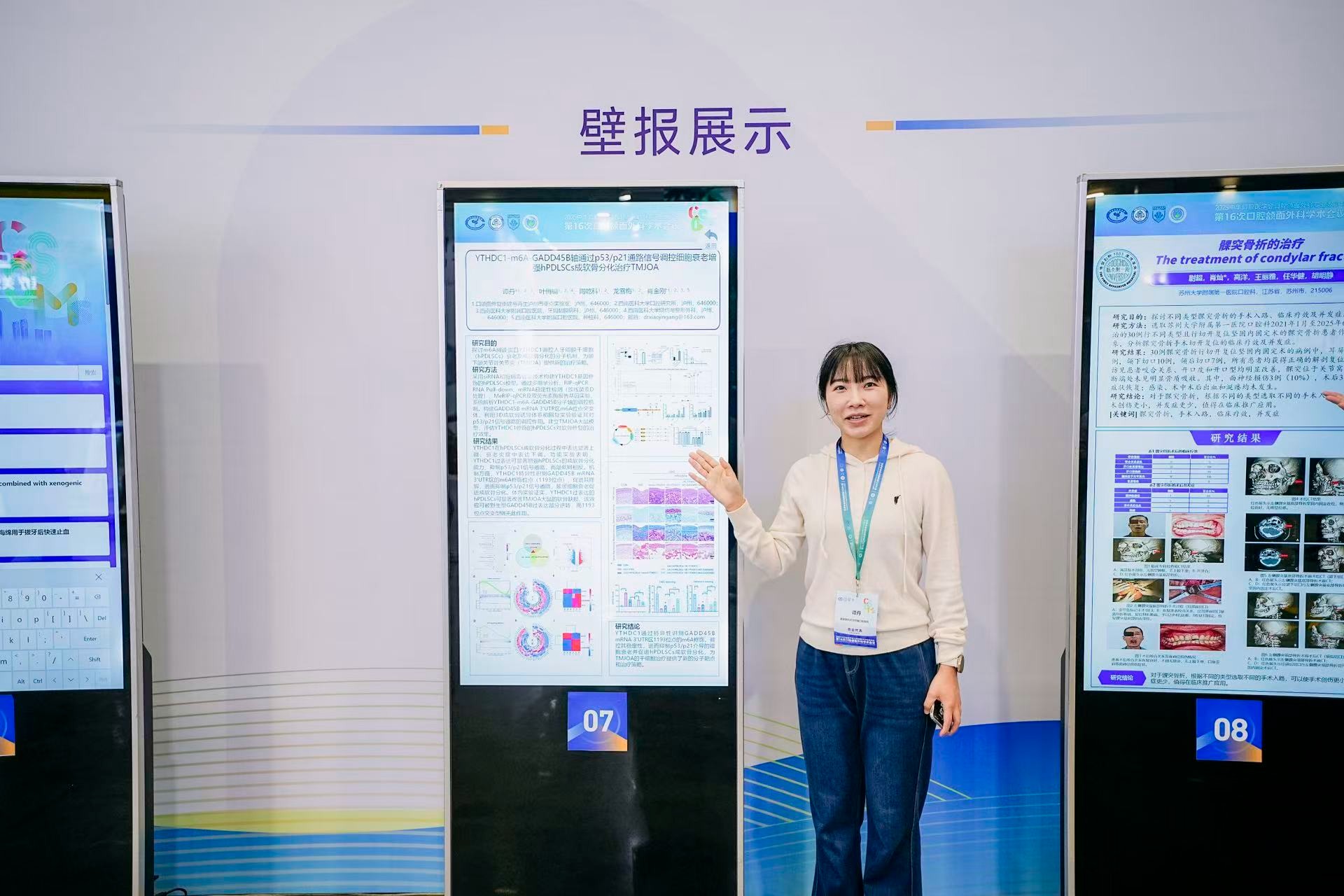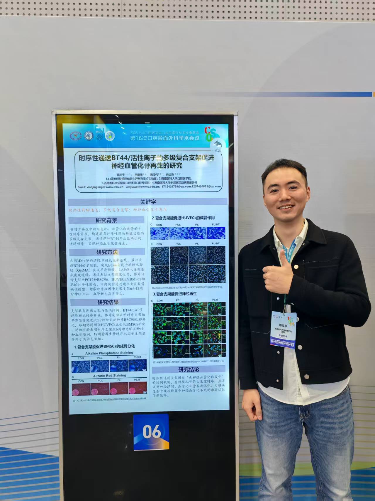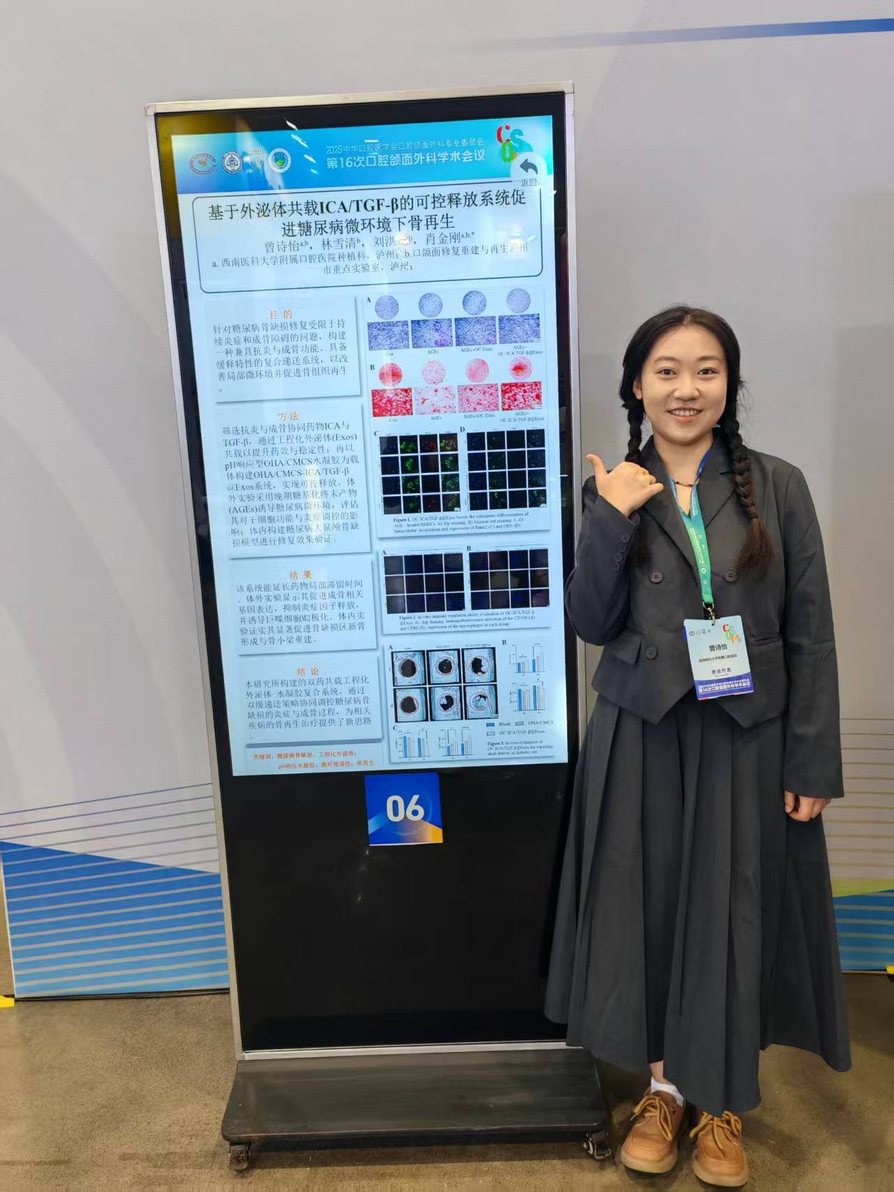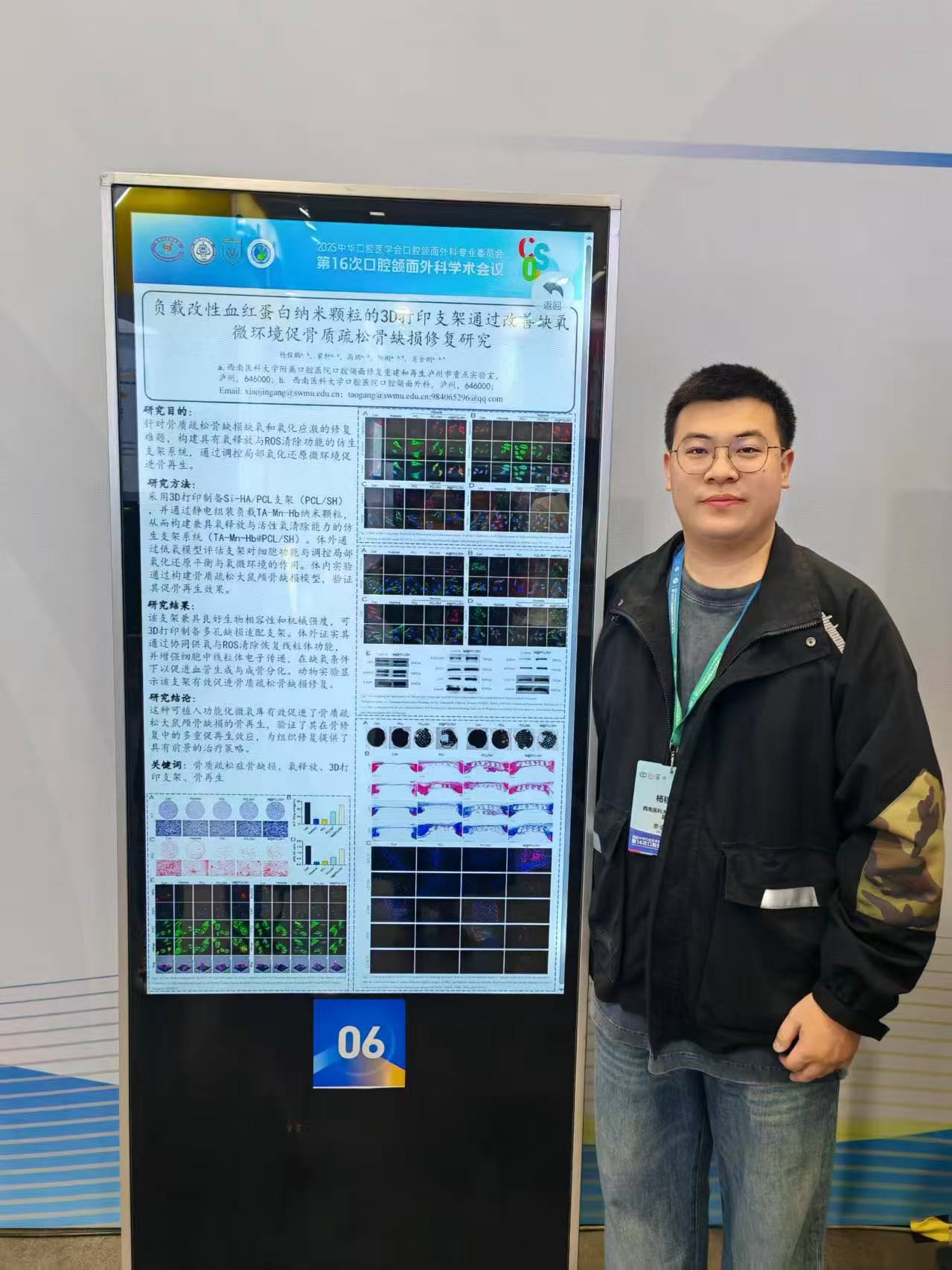 肖金刚教授指导的硕士研究生陈泓宇、杨程鹏、曾诗怡,分别展示了《时序性递送BT44/活性离子的多级复合支架促进神经血管化骨再生的研究》《负载改性血红蛋白纳米颗粒的3D打印支架通过改善缺氧微环境促进骨质疏松骨缺损修复研究》《基于外泌体共载ICA/TGF-β的可控释放系统促进糖尿病微环境下骨再生》。这些报告与展示,充分展现了医院在口腔颌面外科相关基础研究领域的持续探索与科研积累。